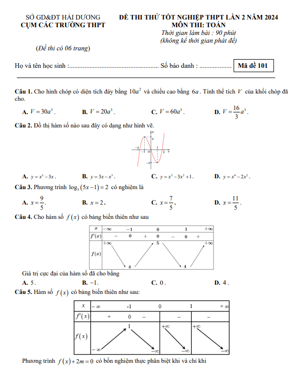 Trích dẫn Đề thi thử Toán tốt nghiệp THPT 2024 lần 2 cụm các trường THPT – Hải Dương: